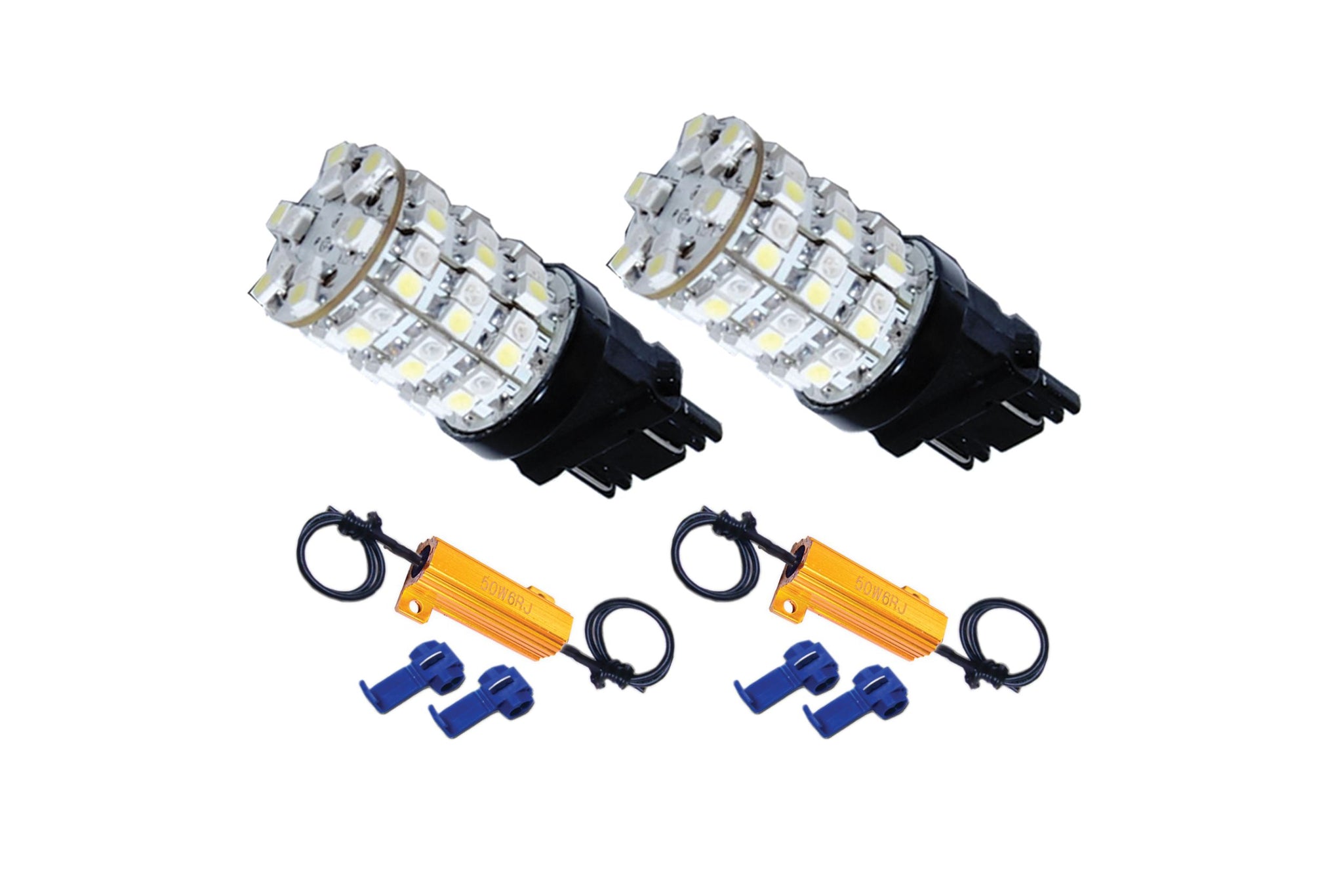 This kit includes a pair of 3157 Switch-Back LED Bulbs and a pair of Load Equalizers. 30pcs White and 30pcs Amber per bulb= 120 total LEDs in this kit! Easy to install, just remove the standard glass bulb and plug in this new bulb then connect the load equalizers to prevent "rapid-flash".