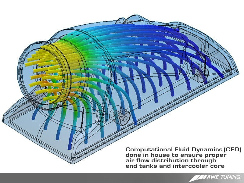 Inlet Air Temperatures are a major area of concern for any turbocharged car. With many modified 996 TTs producing greater than factory horsepower figures, the limits of the stock intercooling system have been far exceeded. Capable of handling well over 700hp, AWE 996TT Intercoolers are the best solution for owners looking to upgrade their factory system with a properly engineered solution. AWE designed a cast end tank utilizing CAD and CFD (Computational Fluid Dynamics) software to ensure proper flow distribution through the end tanks and intercooler. Tested extensively on AWE's in-house dyno, street, and track, these intercoolers will perform flawlessly no matter the environment. Compared to stock, AWE cores are 37% larger (422 cubic inches vs 308 cubic inches). In contrast to the stock cores, AWE's are a high flow bar and plate style. The result? Improved intake temperatures by a massive 55F and improved drop pressure resistance through the core by 1 psi. Considering that extremely little trimming is involved to fit such effective units to the car, this is a huge engineering feat. In addition to the superior core and end tank design, the AWE kit also features 6-ply silicone hoses with gentle curves to prevent bursting under pressure. Further, AWE's hoses use Nomex braiding for superior strength, instead of the more common polyester. The very best materials and industry-leading engineering separate this kit from all others on the market. To ensure OE reliability, AWE uses CNC Machined factory-style aluminum connections to mate the hoses to the factory Y-pipe.