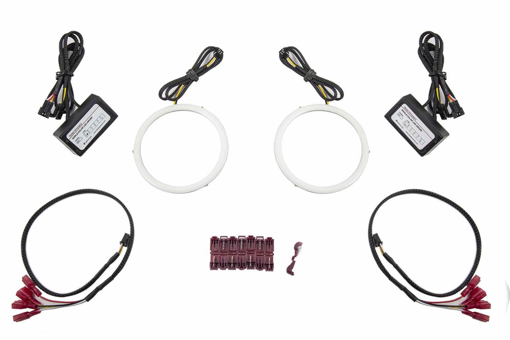 Features: Proprietary durable phosphor coating, for uniform solid appearance. Multi-function PWM drivers, fully waterproof, featuring low power, high power, and turn signal modes. Extremely bright, high-density LEDs that are visible even in direct sunlight. Integrated mounting tabs for easy installation. Made in USA. HDHalo Technology: These HD LED halo rings have been designed from the ground-up to be absolutely the brightest, most reliable halos physically possible. Each halo is populated with a large number of high-density (HD) LEDs, which are then coated by a diffusing gel, resulting in a perfectly uniform light when turned on. When off, the diffusing gel hides the chips, resulting in a clean, OEM appearance. Sizing: All sizes are listed by outside diameter, in millimeters. Width is 8mm, so inside diameter is 16mm less than outside diameter. Total height is 4.5mm. Mounting: The halos must be custom-mounted in position using adhesive or beading wire using the integrated mounting tabs. If you wish, mounting tabs may be removed with a pair of clippers or basic sanding. The halos can be modified if needed to fit certain applications. Up to 20% of the halo can be removed using side-cutting snips and still remain fully functional. Click here to learn more: Cutting HD Halos and Strip video. Wiring: All wires have a durable braided wire covering. The LED has a 20-inch wire with female JST type connector. This connector may be de-pinned in order to run wires through small holes during installation. Both the input and output wire on the driver are also 20 inches each. A pigtail is included that is also 20 inches, with male spade connectors on the end to connect to factory wiring with included T-taps. You will have plenty of room to run wires anywhere you'd like. PWM Control: Aside from the high brightness and perfectly uniform output, one great feature of these halos is the integrated multifunction PWM dimming control. The drivers have four wires, to be connected to any 12V signals as follows: White: White Low Power, 50% brightness. Red: White High Power, 100% brightness. Yellow: Amber Signal, double brightness, flashing (dims if powered more than two seconds). Black: Ground. Wiring: All input wires activate the halos, at different brightness levels. All switchback halos ship with "low" priority drivers. This means that if both "low" and "high" power inputs are powered, the LED will light up in white, with low power level. This is convenient for connecting the red wire to a parking light or DRL signal, for use during the day as a high-power DRL. Then, if the white wire is connected to the headlamp power, they will dim down at night. If the yellow wire is powered at any time, the halo will light up in amber color, intended for signaling. If you'd like to use amber all the time, no problem! It will dim automatically if powered for more than two seconds, to keep it safe. This entire setup allows you to connect the halo directly as a multifunction lamp, without any external controllers needed. Of course, this is completely optional. You can just use one or two of the input wires if you'd like.