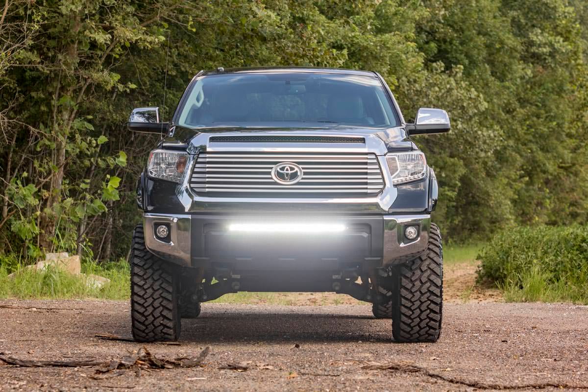 COMMAND THE DARK: Give your Toyota Tundra the power of off-road illumination with Rough Country's 30-inch Hidden Bumper LED Kit. This all-inclusive lighting kit fits perfectly into the factory opening on Toyota Tundras, housing a 30-inch LED Light bar for impressive lighting power. This kit includes a Rough Country 30-inch CREE LED Light Bar, featuring a durable, die-cast aluminum housing that offers incredible protection while the IP67 Waterproof design wards off mud, water, and dust. The included mounts provide a clean, flush look that blends in so well youΓÇÖll never see an Tundra bumper the same way! ItΓÇÖs the perfect position for extra lighting that youΓÇÖll find handy time and time again. Includes Rough Country's 3-Year LED Warranty and a Lifetime Warranty on the mounting system.