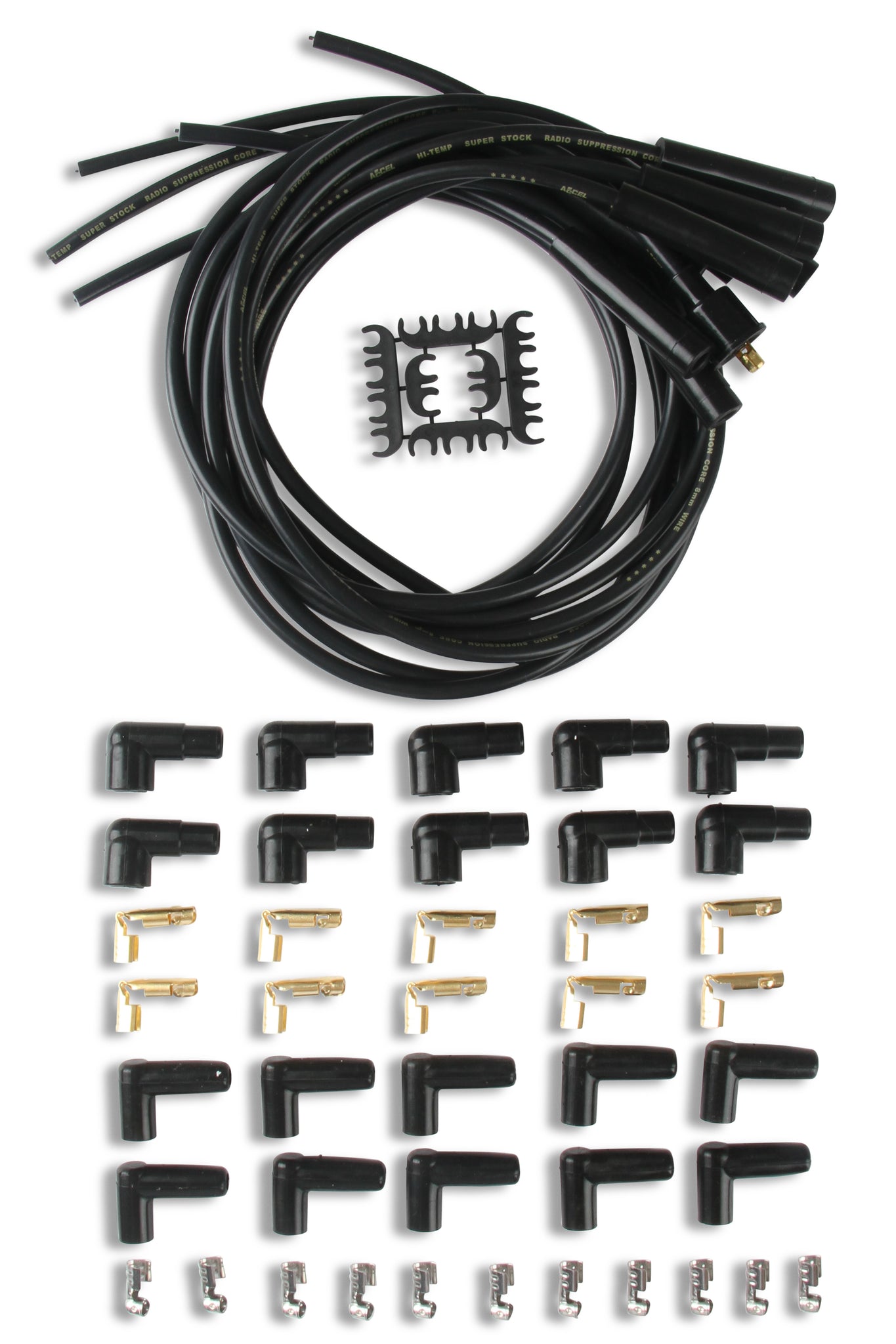 ACCEL's SuperStock 4000 series spark plug wire sets are designed to upgrade an OE ignition system for high-spark delivery levels for street driven applications. The 450 degree F rated silicone jacket is extruded over a tightly woven, rugged fiberglass braid. The braid is applied over high dielectric strength EPDM (Ethylene Propylene Diene Monomer) inner insulation for ignition wire performance that exceeds SAE specifications.