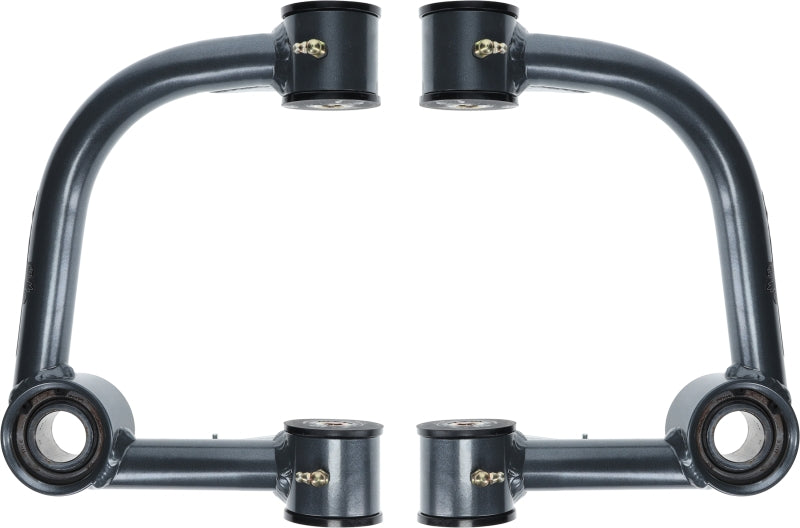 When lifting your truck, the stock upper arms become the limiting factor and hold back your suspensions performance. Our Camburg upper arms address these issues and more.  Replacing the stock ball-joint  with a larger 1.25 uni-ball bearing we’re able to gain wheel travel with a part that is considerably stronger and will last longer under extreme conditions. We build more caster and change the camber curve to correct geometry so the vehicle aligns correctly and improves driving characteristics and handling. Using the latest CAD/CAM engineering software we design these arms to the strictest standards using our FARO laser scan arm to model the OEM parts and frames. Manufactured in-house, we have the tubes CNC laser cut and bent, then are MIG welded in precision fixtures before sending out to be sandblasted and powder-coated. Our in-house CNC machine shop makes all the machined parts including the uniball mis-alignment spacers from heat-treated stainless steel. We pride ourselves in producing the best parts available under our own roof and control. Increases usable wheel travel Corrects camber and caster Eliminates weak factory ball-joints Thicker.156" wall round tubing Laser cut and CNC bent tubes MIG welded CAD/CAM engineered Polyurethane frame pivot bushings with grease-able zerk fittings FK 1.25" PTFE-lined uniballs pre-installed Steel gray powder-coating All necessary hardware included and ready to install Made in the USA Designed for 1-3" of lift Increases usable wheel travel Corrects camber and caster Eliminates weak factory ball-joints 1.25" FK uniballs.
