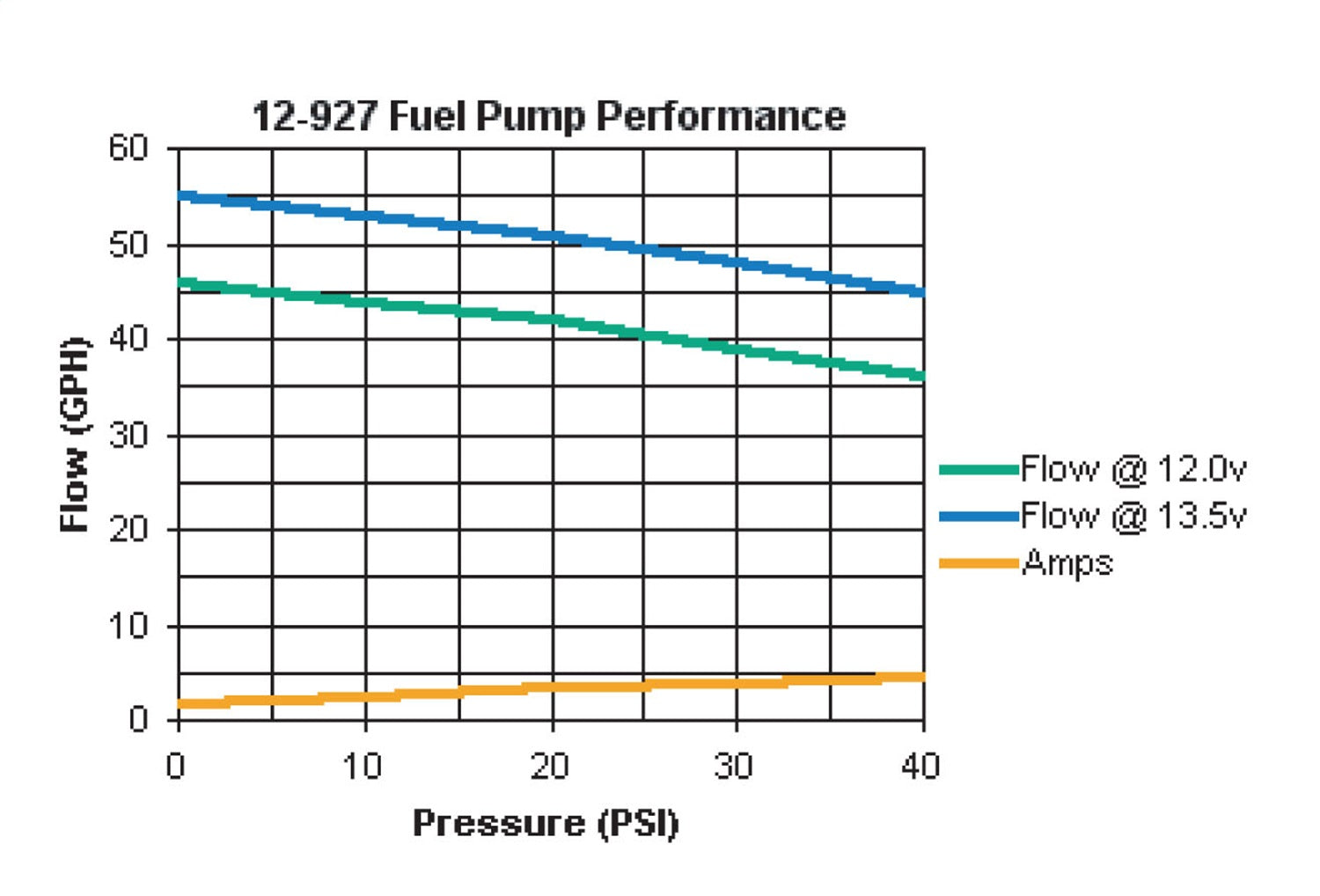 The 12-927 universal in-line fuel pump is intended for Throttle Body EFI systems. It is designed to work in-line, not inside the tank, so installation is a snap. The 12-927 is rated for continuous duty service and have been tested up to 2,500 hours.