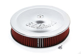 Edelbrock triple chrome-plated round air cleaner #1224 works with all popular 5-1/8" diameter carburetors (Performer Series, Thunder Series AVS, Holley, Thermo-Quad, Quadra jet and Carter AFB). The 10" and 14" models have knock-outs in the air cleaner base for use with Edelbrock crank case ventilation adapter #1205 (sold separately). #1208, #1209 and #1221 fit all Edelbrock carburetors. Heights of air cleaners are in parentheses, measured from the gasket flange to the top of the supplied retaining nut. Dimensions are accurate within 1/8".