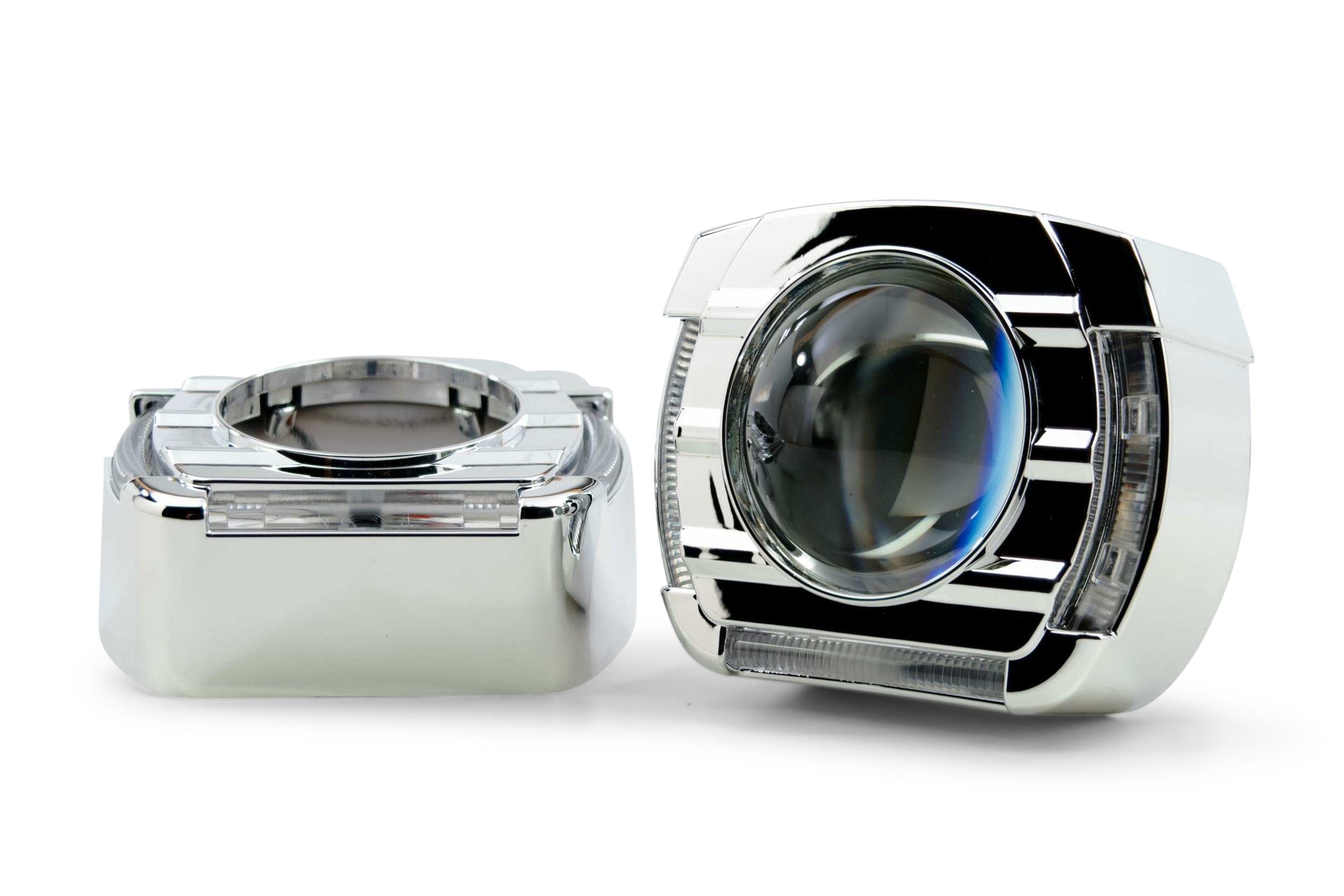 FlatBoy! At we, all shapes matter! And we think it's a shame that there aren't enough squared-off shrouds for retrofitters working on rectangular reflectors (say that 3x fast!). The all new FlatBoy shroud rocks a 3-sided Type II white/amber switchback light pipe on the front that's extremely bright thanks to its BMW-like optics. Not only that, but they also incorporate a "dim" white trigger for perfect DRL functionality. In Comparison: Don't make the mistake of thinking all shrouds are created equal. Even though less expensive alternatives may be available elsewhere: Morimoto shrouds are made from the highest quality plastic and have by far the most durable metalized chrome finishes. The cheap-o's out there are flimsy enough to deform from the heat just a 35W HID bulb, and their chrome finish easily flakes off. Mounting: Centric Rings are not included by default, but are highly recommended to improve ease of installation on many projectors. The Centric Rings are simple reducers that clip into the shroud to reduce the inside diameter, making them more of a "press fit" onto the lens holder of the projector. JB Quik Weld is also recommended in order to prevent the shrouds from vibrating loose over time. Trimming: Please note that trimming shrouds is a common task when retrofitting. Whether required to clear part of the projector, or fit within the geometry of your headlight housing; it's normal. Luckily, they're made of plastic - making that easily possible. We recommend a Dremel hand tool with EZ Lock cutting wheels to make the job easy.