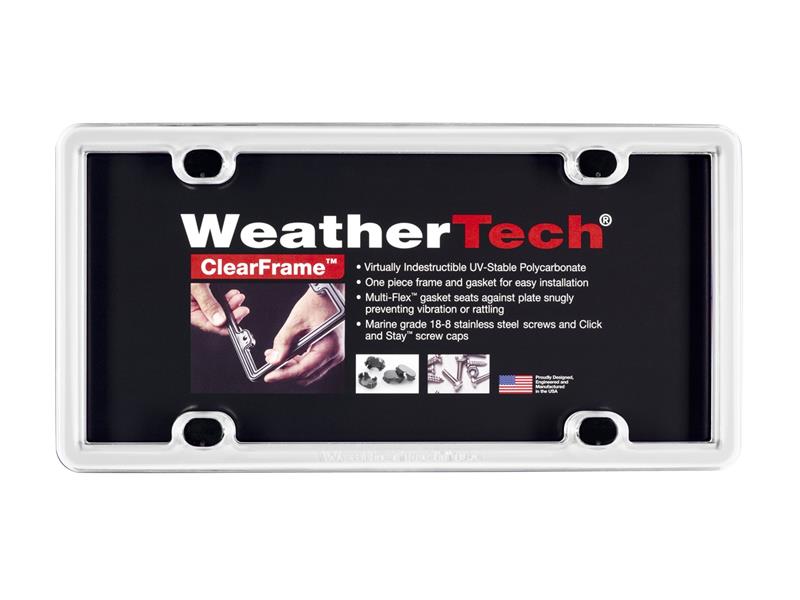 The WeatherTech ClearFrame License Plate Frame has all of the features of the ClearCover in a frame. It is made from virtually indestructible Eastman Durastar Polymer. Its one piece frame and gasket design allows for easy installation. The Multi Flex Gasket seats against your plate snugly preventing vibration or rattling. Marine grade 18/8 stainless steel screws and Click and Stay screw caps are included. WeatherTech ClearFrame has many styles to choose from, and will compliment any vehicle. WeatherTech ClearFrame are guaranteed against faulty materials and workmanship for a period of three years.